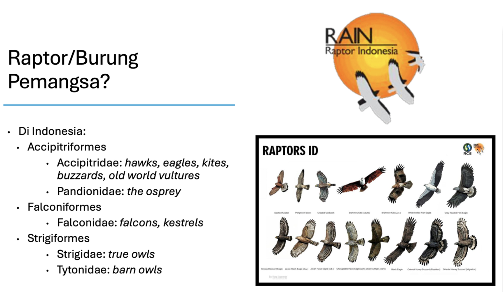 Tedi Setiadi: Raptor mencakup kelompok elang-elangan dan burung hantu yang di Indonesia setidaknya terbagi dalam tiga ordo: Accipitriformes, Falconiformes, dan Strigiformes. Dalam bahasa Indonesia, istilah bagi raptor umumnya relatif terbatas. Jenis burung pemangsa dikenal sebagai elang, alap-alap, atau rajawali, sementara dalam bahasa Inggrisnya lebih spesifik.